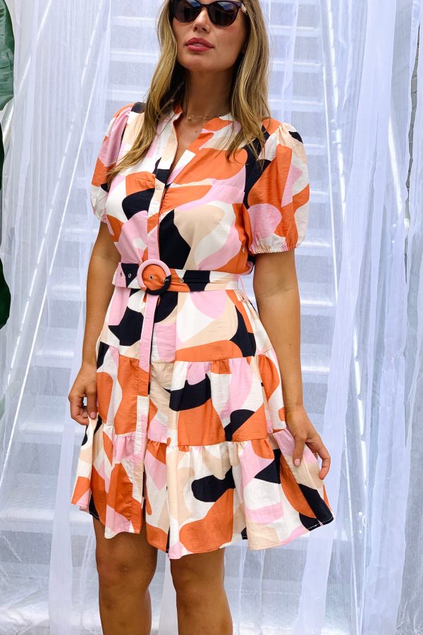 The Silkblousego is a Short sleeve shirt dress style in a multi print of colours , beige, whites and orange tones, this cute short shirt style dress with tie is a perfect light weight material a dress that will be a favourite this summer. Just let the print do all the talking.